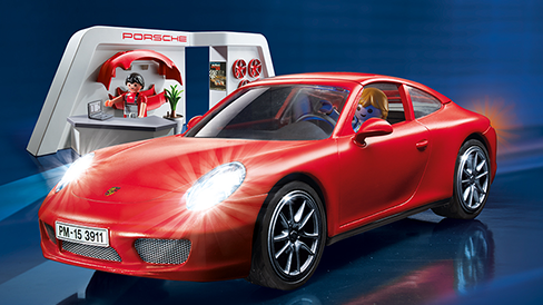 Das Lichtmodul (3 x 1,5-V-Micro-Batterien nötig) lässt Vorder- und Rücklichter sowie das Armaturenbrett leuchten. Der Porsche kann mit Frontschürze, Heckspoiler und roten Felgen getunt werden. Das Dach ist abnehmbar.